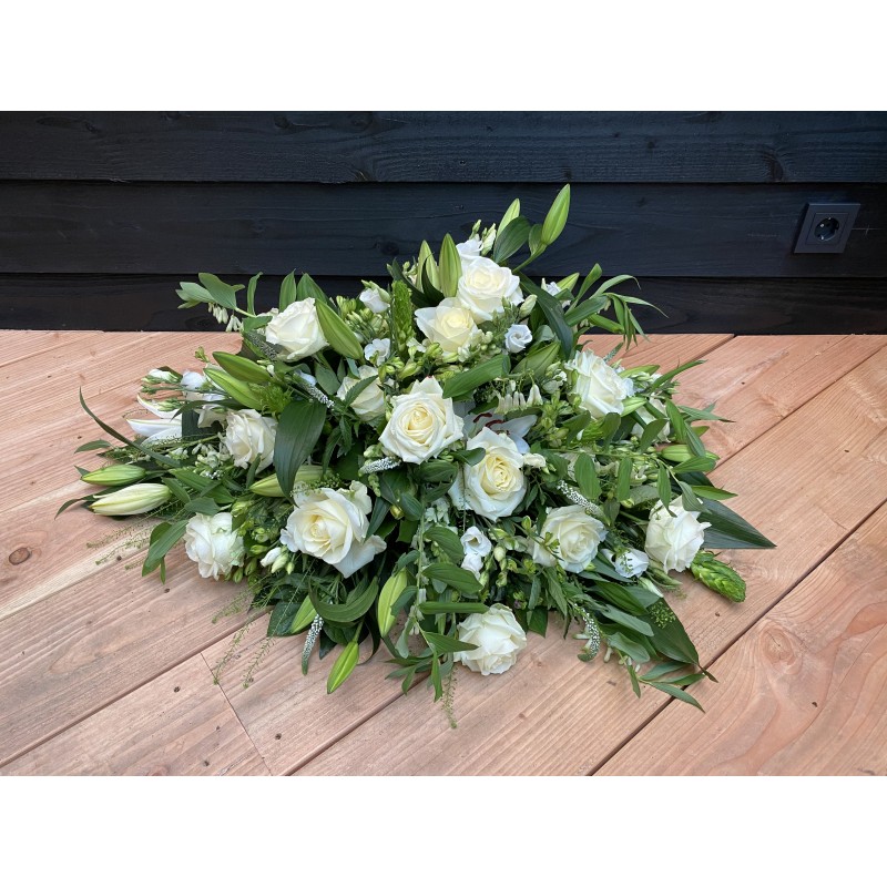 Een rouwarrangement is altijd maatwerk. Hoe eerder u uw bestelling plaatst des te beter kunnen wij het rouwarrangement hetzelfde maken als op de foto. Het is begrijpelijk als u vragen heeft voordat u iets wilt bestellen. Twijfel niet om ons even te bellen om het 1 en ander door te spreken. U bent ook altijd welkom bij ons in de winkel om speciale wensen te bespreken.